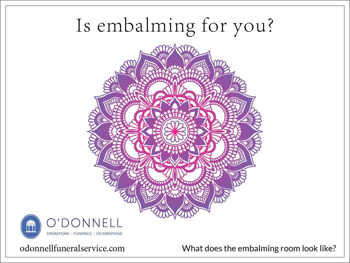 The cost of embalming varies from one part of the country to the next. A family should not eliminate embalming for cost reasons alone. Talk to your funeral director. Always share both your family’s wants and needs as well as your budget with the funeral director. You may be surprised to find out embalming is less expensive than you expected.
